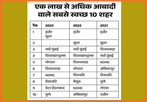 देश के सबसे स्वच्छ 10 शहरों की सूची-