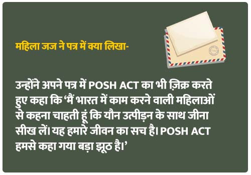 भारत के मुख्य न्यायाधीश डीवाई चंद्रचूड़ को भेजा गये लेटर में यूपी के बांदा जिले में तैनात महिला सिविल जज ने जिला कोर्ट में नियुक्ति के दौरान घटी घटनाओं को भी उजागर किया, साथ ही जिला जज द्वारा अनुचित मांग करने, देर रात घर पर मिलने का दबाव बनाने के साथ ही कार्यस्थल पर महिला सुरक्षा को लेकर कई गंभीर सवाल भी उठाए हैं। उन्होंने अपने पत्र में POSH ACT का भी ज़िक्र करते हुए कहा कि ‘मैं भारत में काम करने वाली महिलाओं से कहना चाहती हूं कि यौन उत्पीड़न के साथ जीना सीख लें। यह हमारे जीवन का सच है। POSH ACT हमसे कहा गया बड़ा झूठ है।’