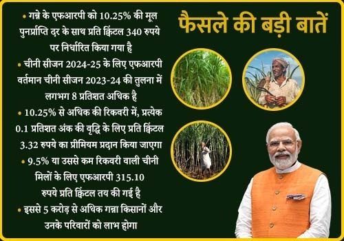 कैबिनेट के फैसलों की जानकारी देते हुए सूचना एवं प्रसारण मंत्री अनुराग ठाकुर ने कहा, 'गन्ना किसानों के हित को ध्यान में रखते हुए आर्थिक मामलों की मंत्रिमंडलीय समिति ने चीनी सत्र 2024-25 (अक्टूबर-सितंबर) के लिए गन्ने के उचित और लाभकारी मूल्य (एफआरपी) को 10.25 प्रतिशत की मूल रिकवरी दर के लिए 340 रुपये प्रति क्विंटल पर मंजूरी दे दी है।