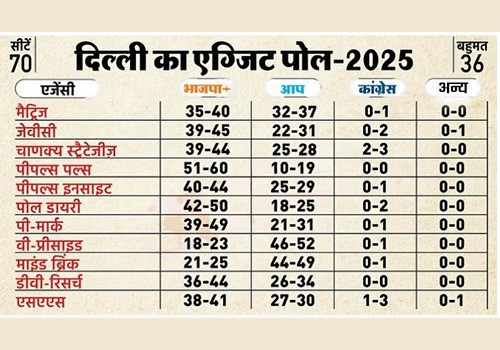 पी-मार्क एग्जिट पोल: भाजपा को 39-49 सीटें और आप को 21-31 सीटें मिलती दिख रही हैं। कांग्रेस को 0-1 सीट मिलने का अनुमान है।